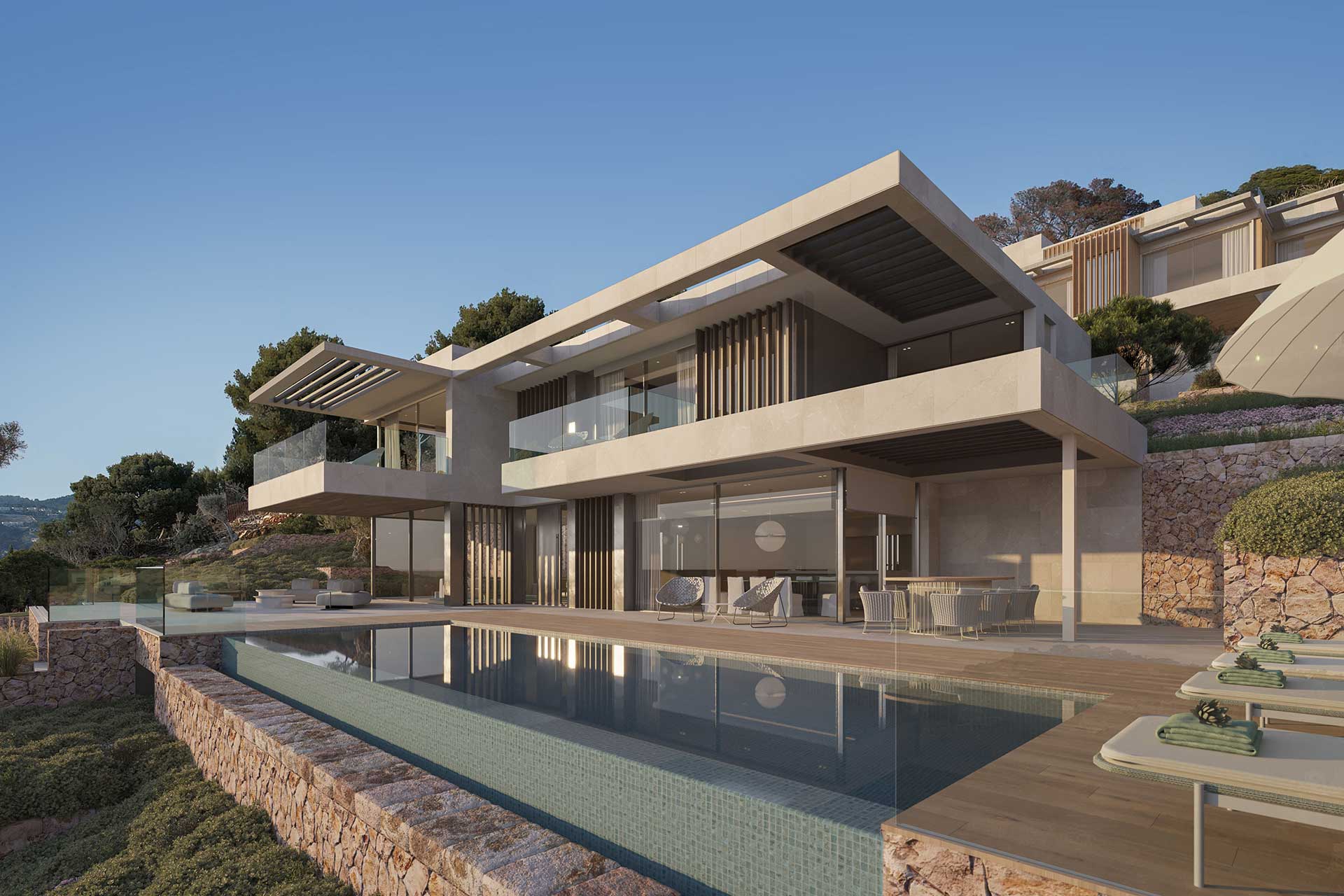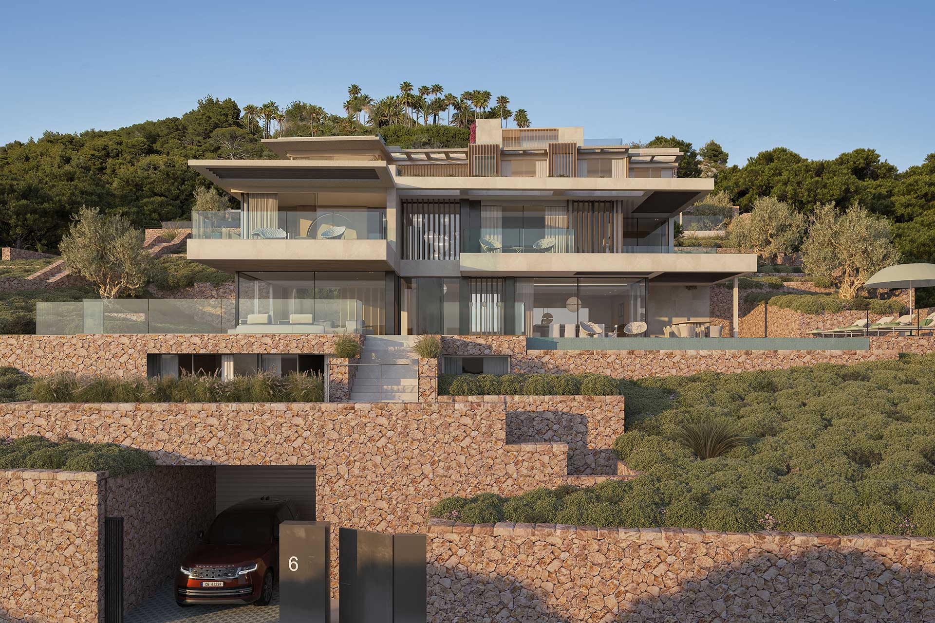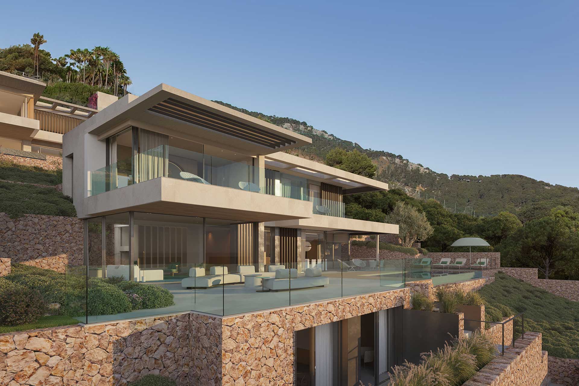 All materials have been carefully selected and are processed with a high degree of craftmanship and precision. Regional references are interpreted in a modern way. The designers have focused on clear lines a high-quality material such as natural stone and fine woods. This villa, unique for Mallorca, guarantees you the highest living comfort trough the insulated facade with high-quality natural stone, smartphone technology, geothermal and solar energy, the property offers a zero-energy standard, unique to the Balearic Island.